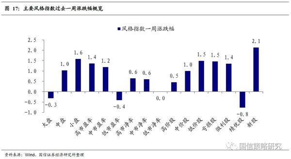 本周风格指数中,各类型风格指数表现分化。新股、低价股,涨幅分别达2.1%和1.5%;绩优股、低市盈率,跌幅分别达0.8%和0.4%。中盘股涨1.0%,小盘股大涨1.6%,均超过大盘。