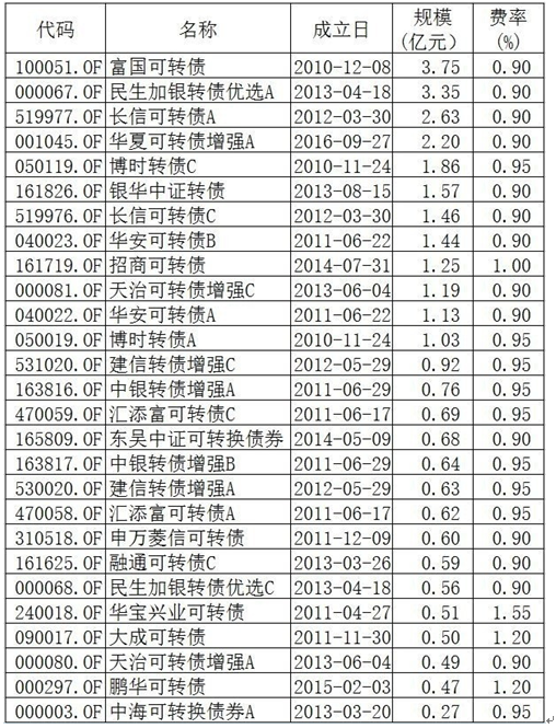 先把市场主要的可转债基金数据列出,看看成立日期、规模与费率等指标。必须要说明的是,由于基金审计费、信息披露费用为固定费用,对规模较小的基金业绩有一定拖累作用,规模低于1亿的转债基金配置价值相对不高。
