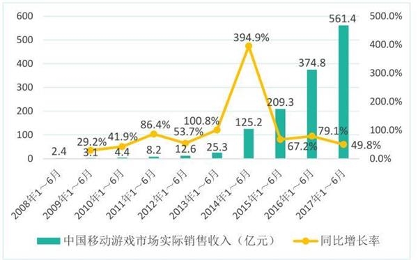 根据中国音数协游戏工委(GPC)、伽马数据(CNG)、国际数据公司(IDC)联合发布的《2017年1-6月中国游戏产业报告》,2017年上半年,中国游戏市场实际销售收入达到997.8亿元,同比增长26.7%,210.3亿元的收入增量成为自2009年以来所有上半年收入增量中的新高。