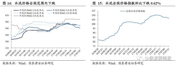 水泥价格指数持续下降,玻璃价格环比微降,同比维持高速增长。(1)7月31日,水泥全国价格指数106.50,环比下跌0.62%(上周环比下降0.30%).(2)华北、华东、西南、中南地区水泥价格环比下跌0.61%、1.53%、0.71%、1.02%,东北水泥价格环比持平。全国水泥价格持续下跌主要是雨季影响了水泥的需求。(3)7月31日,全国主要城市浮法玻璃现货平均价为73.48元/箱,环比下跌0.38%,同比继续保持18.37%的较高增速。