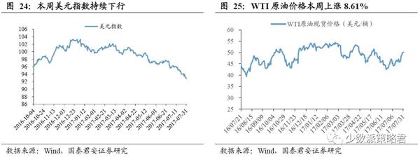 美元指数下跌0.66%,WTI原油现货价上涨8.61%。近期美国经济数据喜忧参半。根据美国商务部7月28日公布的数据显示,美国二季度实际GDP年化季环比初值增2.6%,虽比预期略低0.1%,但创去年三季度以来新高,较一季度提升1.4%。利率方面,美联储FOMC会议宣布,将维持利率在1%-1.25%不变,并表示若经济发展符合预期将“相对较早”开始进行“缩表”,进一步提升了市场对9月份缩表的预期。同时,联储承认近期通胀下行态势。受此影响,本周美元指数继续下跌0.66%至93.35,已至2017年内新低。石油方面,三季度原油需求旺季已至,美国油品库库存继续降低,沙特明确8月份的原油出口量的限制。多重利好叠加,本周油价大幅上涨。