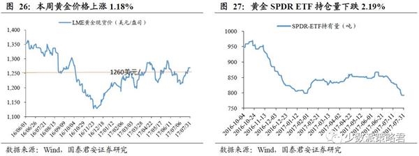 黄金价格本周上涨1.18%。黄金ETF持仓量下跌2.19%。上周美联储FOMC会议声明维持利率不变,且承认通胀下行。市场对9月缩表,12月加息的预期加大,我们认为此次FOMC传递的鹰派立场信号减弱,收紧流动性的计划不及预期,美元指数本周继续低迷。受美元疲软影响,黄金延续了上涨的态势,LME现货价周环比上涨1.1%至1268.7美元。