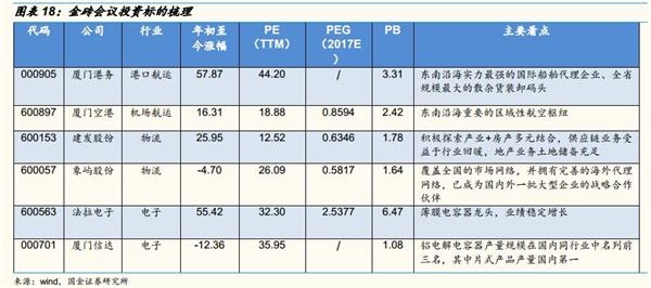 1)投资主线一:“一带一路”+福建自贸区。金砖会议的召开将进一步推动厦门作为一带一路港口城市的战略地位,同时也会吸引更多的外商进入厦门本地,对福建自贸区的建设起到一定的拉动作用。推荐关注:厦门港务(福建省规模最大的散杂货装卸码头),厦门空港(东南沿海重要的区域性航空枢纽).