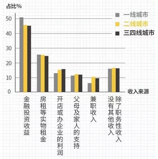 有意思的是,二线城市16.2%的新中产通过开店或办企业来增加收入,而这个比例在一线城市只有12.8%,在金融投资收益上,一线城市拥有金融投资收益的比例达到51.5%,而在二线城市中占比仅为45.6%。