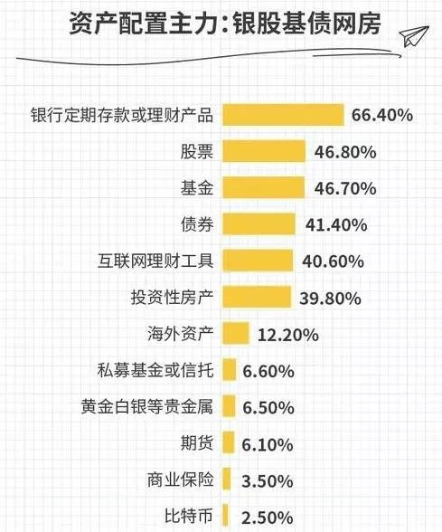 而吴晓波频道的新中产报告显示,在新中产投资理财的配置品类中,最主流的是银行定期存款或理财产品、股票、基金、债券、互联网理财、投资性房产这六类。其中46.8%的人配置了股票。