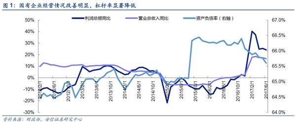 国有企业改革成效明显。从2016年年中以来国企整体持续的经营改善和利润修复是国企经济向好的具体表现。在供给侧改革的推动下,国企的杠杆率不断下降。国企正在上演强者俞强的模式,优势企业得到进一步发展。国企改革的初步成效也是为实现国有资产保值增值这一目标打下一支强心剂,进一步确认目前正在实施的国企改革举措方向是正确的,我们认为下半年国改将进一步加速。