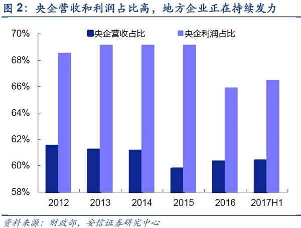 国企改革对于降低国有企业的杠杆率有显著成效,僵尸企业加速淘汰。自2015年年中以来,国有企业的资产负债率呈现持续下降趋势,截止2017年6月,国企微观杠杆率(负债/资产)已经从最高点的66.4%下降到65.6%。国有企业杠杆率的降低,加速淘汰落后高负债率僵尸企业。其中央企作为国企的主要利润贡献力量,在国改中业绩亮眼。央企营收占比在近几年均占60%,其中利润的贡献在最高时可达87.3%。截至2017年6月,央企利润累计达9352.1亿元,同比增长18.5%,地方国有企业利润则为4720.2亿元,同比增长达37.5%。值得一提的是,财政部数据显示2017年6月央企单月利润为2128.6亿元(详见文末注释1).2017年上半年102家央企中游99家盈利,其中盈利超过10%的企业占48家。
