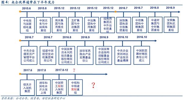 今年上半年自中国轻工和保利集团拟合并,中核和中核建筹划合并的消息以来,在2017年6月今年第一次央企合并才正式落地,随后在8月2日,神华和国电的合并方案正式上报。回顾2015年以来的各大央企合并重组情况,主要集中在下半年:上半年主要以规划为主,下半年是正式的操刀实施时间。我们认为,2017年下半年央企大概率会继续发生重组合并,重点关注业务趋同的企业。