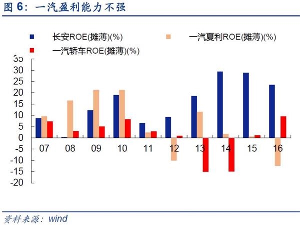 长安汽车盈利能力强,业绩优秀.根据长安汽车公布的产销数据,2017年1~6月,长安汽车累计产量为138万辆,而销量为143万辆,同比分别下滑5.3%和3.6%。然而2016年,长安汽车以102.85亿元净利润,成为重庆工业史上第一家净利润超过百亿元的内资企业,旗下自主品牌汽车销量达到128万辆,巩固了汽车自主品牌第一销量的地位。此外,长安汽车与百度合作开展了中国第一个无人驾驶试验并取得阶段性成果,2000km无人驾驶取得圆满成功。相比于一汽夏利和一汽汽车而言,长安盈利能力较强。
