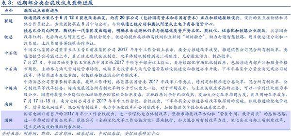 写在前面的话:在上个月的报告《国企改革:新标杆和新趋势》中,我们解析了国企改革的最新发展方向。正如我们此前一直强调的,进入第三季度,国企改革推进开始加速:央企方面,此前筹谋的央企重组如神华国电合并方案上报国务院;联通正与约20家公司进行混改最后阶段洽谈;铁总近期也动作频频,邀请阿里腾讯参与混改。地方国改方面,各地国改进展飞快,江苏召开国改推进会,天津、山西成立国资运营平台,上海成立国方母基金等。在十九大召开的前夕,中央和地方有争先展示国改成果的意愿强烈。当前国改进程如何?国改对资本市场有哪些影响?国改有哪些成果?这些成果将带来哪些投资机会?本篇报告为您解读。