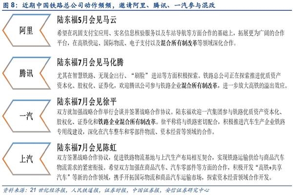 今年以来,铁总混改步伐显著加快,新年伊始,铁总就提出:2017年将坚持深化供给侧结构性改革,推进铁路资产资本化经营,研究推进铁路企业债转股,研究探索铁路资产证券化改革。铁总已分别向阿里、腾讯和一汽集团发出邀请,明确表示欢迎他们参与铁路优质资产资本化、股权化、证券化和铁路企业混改。近日,铁总也和上汽集团签署了战略合作协议。预计今年下半年铁路混改将再次提速,且更具亮点。