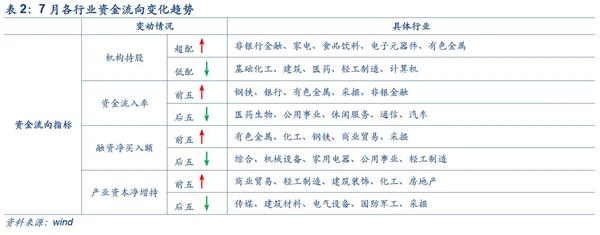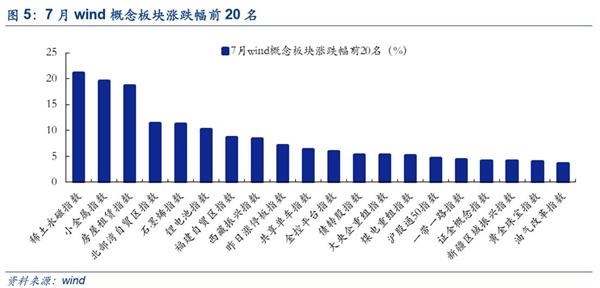 7月涨幅前五的行业分别是有色金属(20.56%)、钢铁(16.23%)、采掘(8.07%)、化工(5.56%)、银行(5.36%)。跌幅前五的行业分别是医药生物(-4.75%)、计算机(-4.75%)、传媒(-4.70%)、公用事业(-4.25%)、家用电器(-3.99%)。