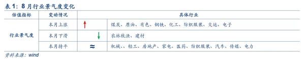 7月上游资源品价格齐涨,景气高位上涨。其中,煤炭、有色期货贴水修复,现货价格走高;国际原油供给过剩压力环节,油价大涨;有色受全球经济回暖支撑,价格普涨,库存下降。8月建议继续关注供给侧改革进行中的电解铝和受新能源汽车利好的锂、钴和磁材。具体而言,煤炭方面:需求旺季叠加供给受限,7月煤炭价格持续上升,秦皇岛动力煤市场价和平仓价分别较上月上涨3.39%、8.16%;需求方面,7月6大发电集团日均耗煤84.77万吨,同比上涨9.00%,电厂补库存需求旺盛。针对供给紧张问题,发改委于7月17日提出要有序释放优质产能增加供给,考虑到7月需求已达高峰,8月需求进一步上涨的动能减弱,我们预计8月煤价涨幅受限,行业整体景气较此前持平.原油方面:受美国库存下滑和产量下降等因素影响,供给过剩压力缓解,叠加美元走弱影响,7月油价呈震荡上行趋势,布伦特原油期货结算价较上月8.72%,WTI原油期货结算价较上月上涨7.79%。预计8月油价震幅缩窄,维持上行趋势,行业整体景气有所回升.有色方面:国际市场方面,LME有色金属价格整体上涨,铜和镍的涨幅居前,环比上涨6.17%和9.43%;国内方面,电解铝和稀土供给侧改革和整顿继续推进,新能源汽车销量持续向好,利好锂、钴和磁材。黄金受美元走弱影响,上涨2.66%。整体而言,有色行业整体景气较此前提升,重点关注电解铝、铜和稀土。