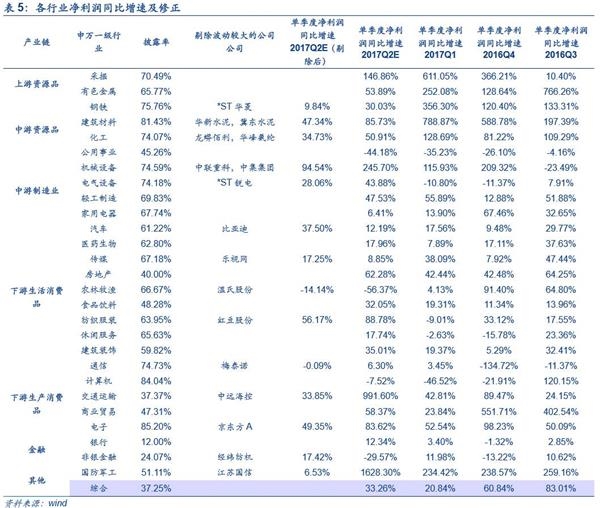 2017Q2净利润增速低位恶化的行业有公用事业、农林牧渔。2017Q2农林牧渔环比业绩继续下滑,净利润同比增速由4.13%下降至-56.37%;在剔除温氏股份后净利润增速由-56.37%上升至-14.14%。公用事业中的电力行业由于煤炭价格大幅上涨,成本端压力上升,二季度盈利增速继续下滑,由-35.23%下滑至-44.18%。