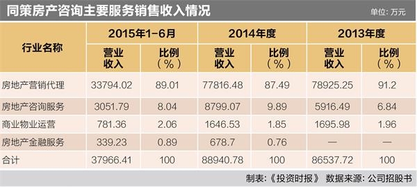 《投资时报》记者查阅该公司招股说明书发现,2012年-2014年,同策房产咨询综合毛利率分别为55.96%、51.34%、44.73%,呈逐年下降趋势,而2015年上半年综合毛利率也仅为37.72%。房地产代理销售业务为该公司的主要收入及毛利来源,公司的综合毛利率变动主要受房地产代理销售业务毛利率变动影响所致。2012年-2014年,代理销售业务收入占当期主营业务收入的比例分别为88.45%、91.20%及87.49%,而它们当年的毛利率则分别为57.75%、51.59%及44.96%,与公司综合毛利率下降趋势相同。