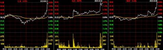 2015年8月13日、10月16日和26日尾市期间,徐留胜控制并使用本人账户,利用资金优势,交易多只股票,导致相关股票走出了尾市强势上涨的走势: