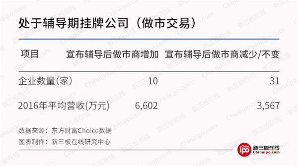 此外,我们通过对10家做市商有所增加的挂牌公司的研究后发现,这10家挂牌公司的质量要好于其他公司。例如这10家企业2016年的平均净利润达到了6,602万元,而同期另外31家没有增加做市商的企业平均净利润只有3,567万元。