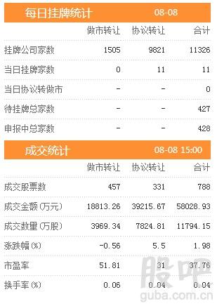 昨日新增挂牌企业11家,挂牌企业总数达到11326家,做市转让1505家,协议转让9821家,待挂牌总家数427只,申报中总家数达到428家。