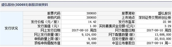 根据交易所公告,深圳市盛弘电气股份有限公司于2017年8月10日进行网上和网下申购。本次发行股份数量为2,281 万股,全部为新股,其中,网下初始发行数量为1,368.60 万股,为本次发行数量的60%;网上初始发行数量为912.40 万股,为本次发行数量的40%。