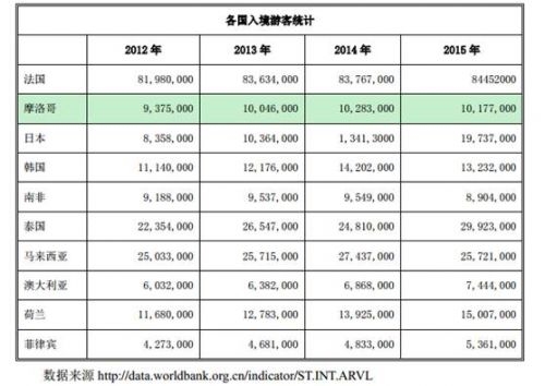 很多中国游客对摩洛哥颇为陌生,但世界范围内,摩洛哥早已被视为著名旅游国家。据世界银行数据显示,直到2012年,摩洛哥全年入境游客人次还与日本、韩国相当,约为1000万人次。但摩洛哥旅游业增长缓慢,到2015年仍停留在1000万人次,而日本、韩国分别达到2000万、1300万。