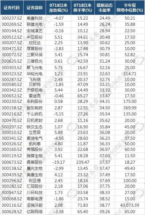 因此,我们对还未披露半年报的585只创业板公司进行了统计,以寻找可能插上证金汇金这对“隐形的翅膀”的个股。如果以最新动态市盈率低于40倍、7月18日以来涨幅低于6%(同期创业板指上涨6.44%)、换手率大于20%、半年报预增中位数在10%以上这四个条件进行筛选,一共有33只创业板个股入围,或许这33只个股只是在等待半年报披露那一刻。