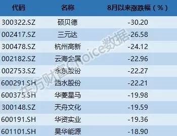 东方财富Choice数据显示,8月以来跌幅靠前的个股中,前十位有三位是创业板个股,其中硕贝德和杭州高新跌幅位列第一和第三。