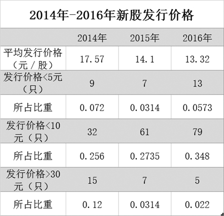 而从低价股所占比重看,也有逐渐增加的趋势。如发行价格低于10元的新股,2014年比重为25.6%,2015年为27.35%,而2016年则有34.80%。