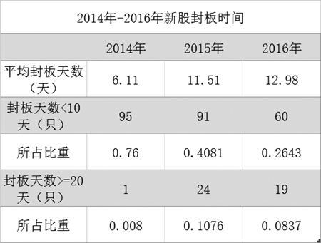 而就平均封板天数看,在2014年~2016年三年里,也有逐年增加的趋势。2016年,平均封板天数为12.98天;2015年,平均封板天数为11.51天;而2014年则为6.11天。不过,封板天数少于10天的新股,在过去3年里,则有逐渐减少的趋势,2014年为95只,2015年为91只,而2016年只有60只。