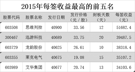 2015年,每签收益最高的为思维列控(603508),每签收益为51682.4元,而最低的为申万宏源(000166),每签收益为2529.6元。