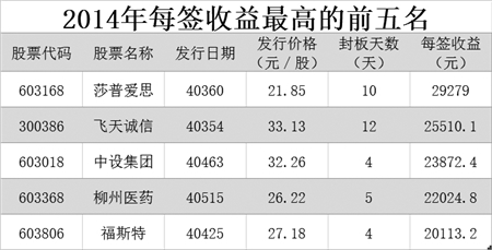 2014年,每签收益最高的为莎普爱思(603168),每签收益29279元,最低的则为山西煤矿(601225),每签收益为1360元。