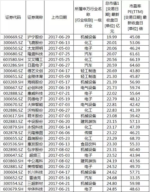 市值较小次新股一览