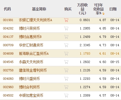 截至8月14日货币基金收益率前十