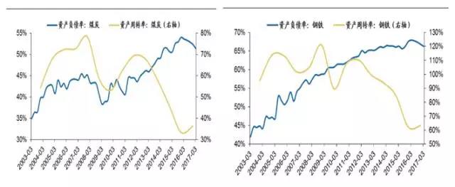 3、从供给端来看,本轮去产能、去杠杆进程仍在半途。参考98-00年煤炭、纺织行业成功经验,通过供给侧改革最终实现了资产负债率的快速下行、同时产能利用率和劳动生产率均实现回升。对比当下,钢铁、煤炭、有色行业资产负债率虽有下行但尚在高位,资产周转率水平仍处于底部回升阶段。