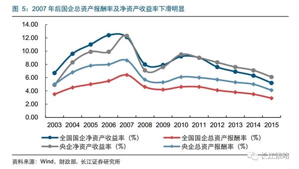 2007年是我国重化工业黄金时期的最后一年,这一年,全国国企和央企的净资产收益率分别为12.1%和12.3%,总资产报酬率分别为6.4%和8.6%。巅峰期过后,国企的资产回报率下滑态势明显。到2015年,全国国企和央企的净资产收益率仅为5.2%和6.1%,总资产报酬率仅为2.9%和4.1%。