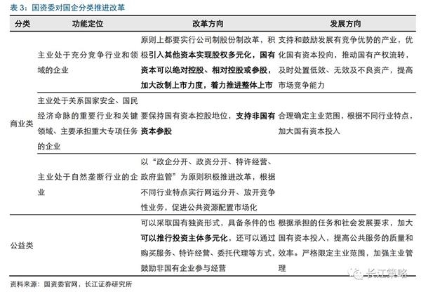 2015年12月29日,国资委、财政部、发改委联合发布了《关于国有企业功能界定与分类的指导意见》,响应了中央提出的分类推进国有企业改革的总体要求。对国企进行功能界定与分类,有针对性地实施分类改革、分类发展、分类监管、分类考核是本轮国企改革的最大特点。