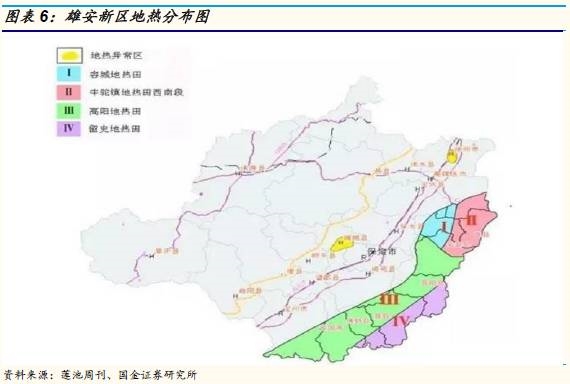 雄安新区规划范围内的雄县、容城、安新三县均位于保定市范围内,从整个保定市来看,经初步评估,保定市地热流体年可开采量达108亿立方米,折合6292万吨标准煤。保定市地热资源主要分布在雄县、容城、安新、白沟新城、高阳等14个县(市、区)。按地质构造划分,保定市平原区地热资源主要分布于牛驼镇地热田、高阳地热田、容城地热田和留史地热田。