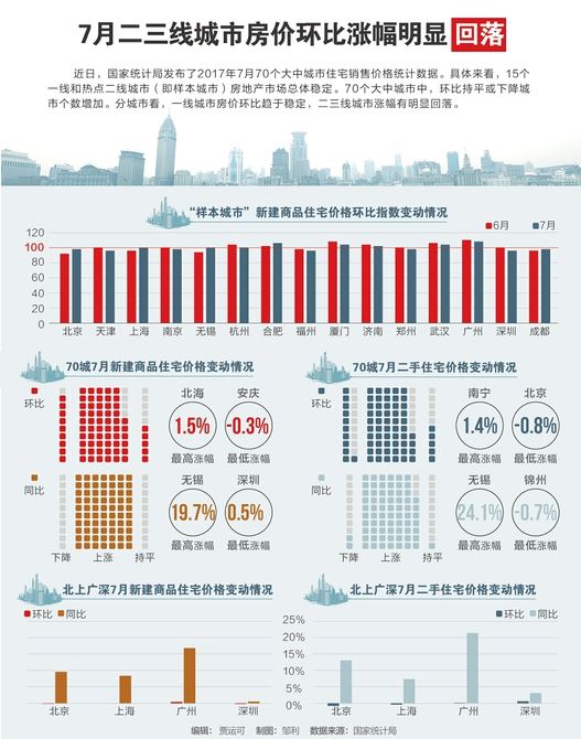 近日,国家统计局发布了2017年7月70个大中城市住宅销售价格统计数据。具体来看,15个一线和热点二线城市(即样本城市)房地产市场总体稳定。70个大中城市中,环比持平或下降城市个数增加。分城市看,一线城市房价环比趋于稳定,二三线城市涨幅有明显回落。