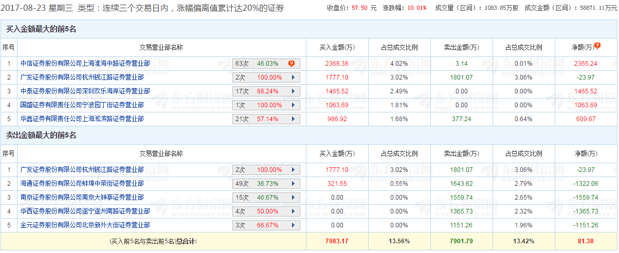 如8月23日当天,在前五大买入主力中,中信上海淮海中路现身第一大,全天共买入2368.38万元,而广发杭州钱江路却在做T,同时现身买入和卖出主力榜上,全天分别各买入和卖出1777.10万元和1801.07万元,净卖出额为23.97万元。