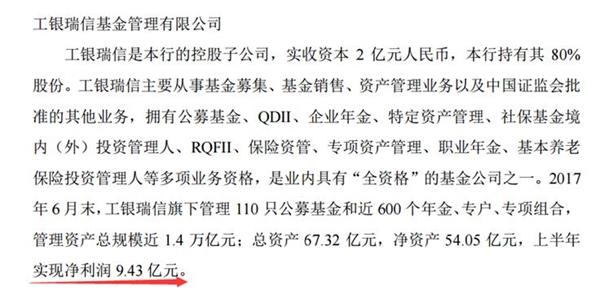 据工商银行披露的中报数据显示,截至2017年6月末,其持股80%的工银瑞信基金管理资产总规模近1.4万亿元,上半年实现净利润9.43亿元。在目前披露上半年净利润的基金公司中,工银瑞信仅次于天弘基金,位列第二。