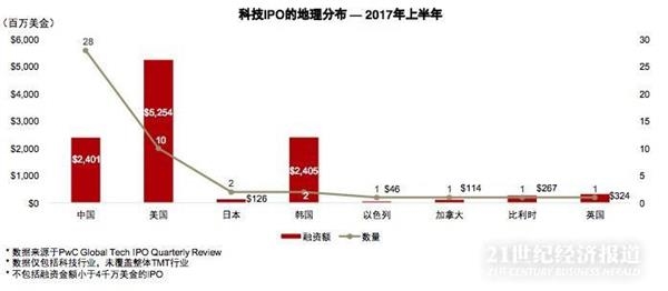 同时,从全球市场来看,根据普华永道近期发布的全球科技企业IPO季度报告(该报告不包括融资金额小于4千万美元的IPO),2017年上半年全球范围内共有46起IPO,环比上涨53%;共获得约109亿美元融资,环比上涨54%。其中,中国科技企业以28起IPO数量处于领先,美国以10起位居第二。从融资额角度看,美国科技企业IPO排名第一,韩国及中国紧随其后。