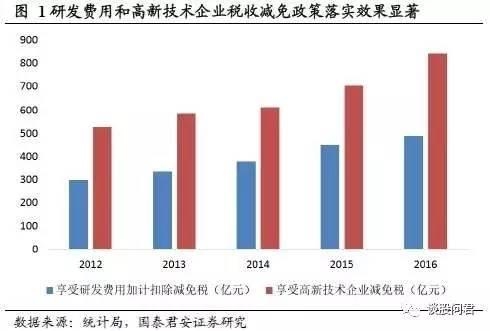 政策支持思路清晰、不断加码,助力中国制造转型升级。制造业是国家经济和发展的重要支柱,更是一个民族的脊梁,其重要性毋庸多言。为抓住新一轮工业革命,中国政府适时提出了《中国制造2025》的国家发展战略,并先后出台了《积极推进“互联网”行动的指导意见》、《深化制造业与互联网融合发展的指导意见》等一系列政策,明确提出以创新驱动、融合发展为主线,以推进智能制造为主攻方向的中国制造业转型升级指导思想,并在财税支持上不断加码。统计局数据显示,2016年我国规模以上工业企业享受研发费用加计扣除减免税和高新技术企业减免税分别比2012年增长63.9%和59.8%;2015年国家财政科技支出比2012年增长25.1%,财政科技支出占当年国家财政支出的比重已达3.98%。