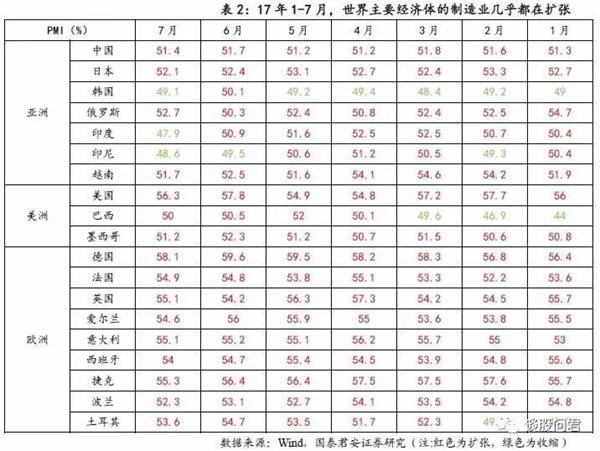 主要经济体制造业同步扩张,反映全球朱格拉周期已开启。跟踪亚洲、美洲及欧洲19个主要国家PMI,我们发现17年1-7月几乎所有国家的制造业都在扩张,韩国表现最差。同时,受益于美日欧制造业扩张,中国制造业出口交货值迅速回升,17年6月累计增速达10.68%,创近5年新高。并且,中国、美国、日本等纷纷出现了设备投资增速回升的现象。我们认为受设备更替和资本开支驱动的全球朱格拉周期已开启。