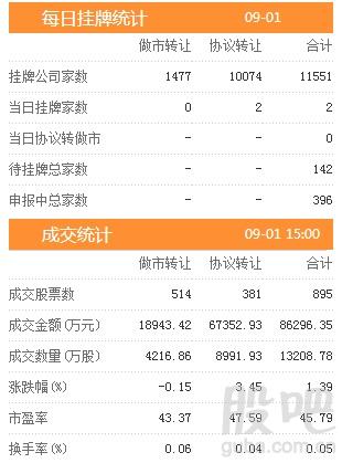 1日新增挂牌企业0家,挂牌企业总数达到11551家,做市转让1477家,协议转让10074家,待挂牌总家数142只,申报中总家数达到396家。