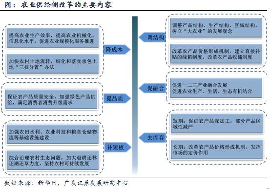 农业供给侧改革的关键词是粮食安全、绿色农业、农业现代化,其内涵在于:在确保粮食安全、农民增收、去库存的基础之上推进农业现代化与规模化。