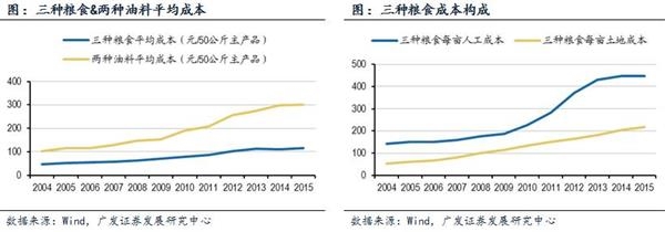 2)农业生产进入高成本时代,国内收储价格过高、生产效率过低。我国主要农产品生产成本不断攀升,与 2010 年相比,2015 年我国稻谷、小麦和玉米三种粮食的平均成本提高了47%,花生和油菜籽两种油料的平均成本提高了60%。