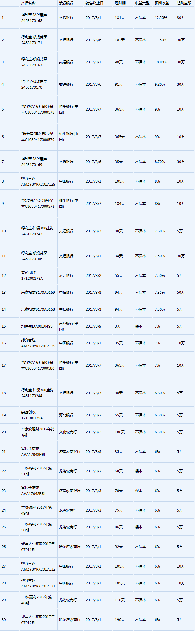 8月1日在售高收益银行理财产品:今日在售预期年化收益率在9%(含)以上的银行人民币理财产品共6款。交通银行(6.570, 0.03, 0.46%)发行的“得利宝·私银慧享2463170168”预期年化收益率最高,为12.5%。