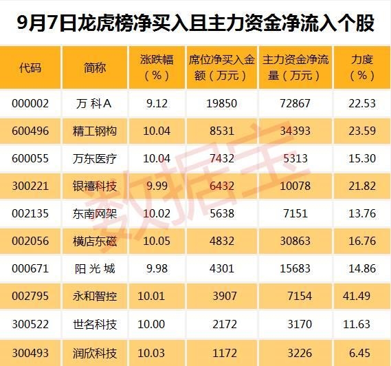 9月7日龙虎榜中机构及营业部席位资金净买入2.39亿元,其中净买入的个股有10只;净卖出的个股有4只。净买入前三名个股分别是万科A、精工钢构(600496)、万东医疗(600055)等,净买入金额占当日成交额比例达6.14%、5.85%、21.40%。