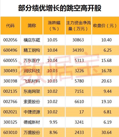 截至9月7日收盘,有22只A股大幅跳空(高开1%以上,剔除一字涨停个股)高开高走,其中横店东磁、精工钢构、万东医疗等个股涨幅最大,分别达10.05%、10.04%、10.04%。