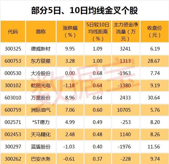 截至9月7日收盘,有29只A股的5日均线主动上穿10日均线,其中德威新材(300325)、东方银星(600753)、大冷股份(000530)等个股的5日均线较10日均线距离最大,分别达1.09%、1.00%、0.68%。