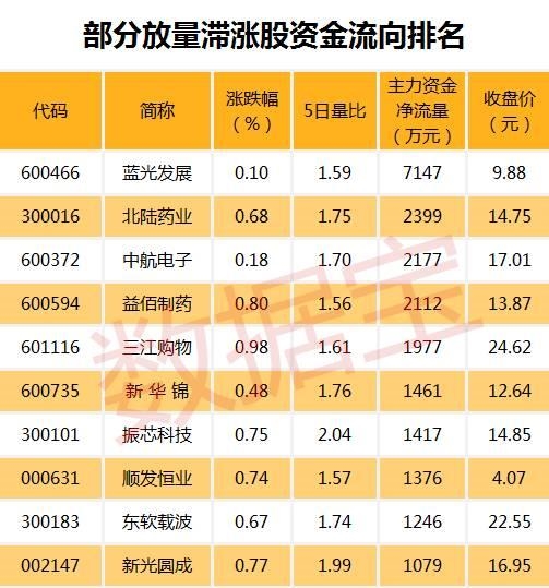值得注意的是,92只放量滞涨股中,蓝光发展(600466)、北陆药业(300016)、中航电子(600372)、益佰制药(600594)、三江购物(601116)等个股主力资金净流入最多,分别达到0.72亿元、0.24亿元、0.22亿元、0.21亿元、0.20亿元。